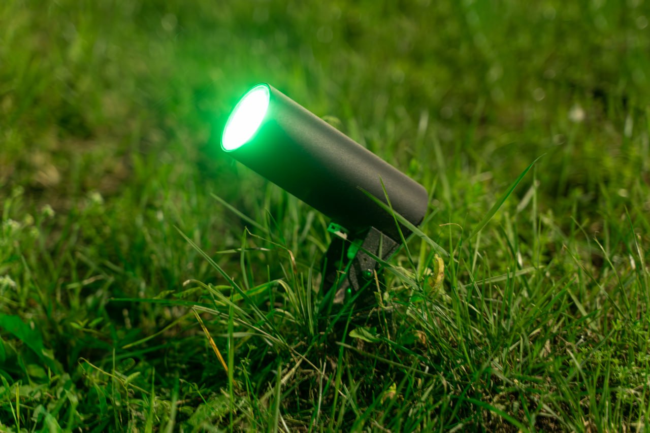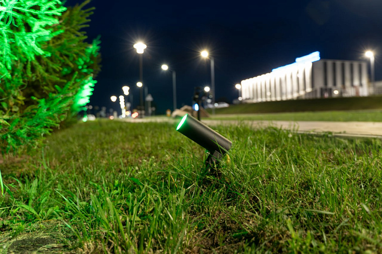 Компактное решение для подсветки архитектурных и ландшафтных элементов. Угол свечения 40°, крепление с поворотным кронштейном, встроенный блок питания. 12 единиц установлены в ключевых точках для создания мягкой акцентной подсветки.