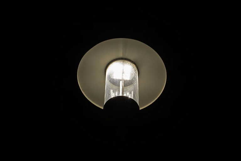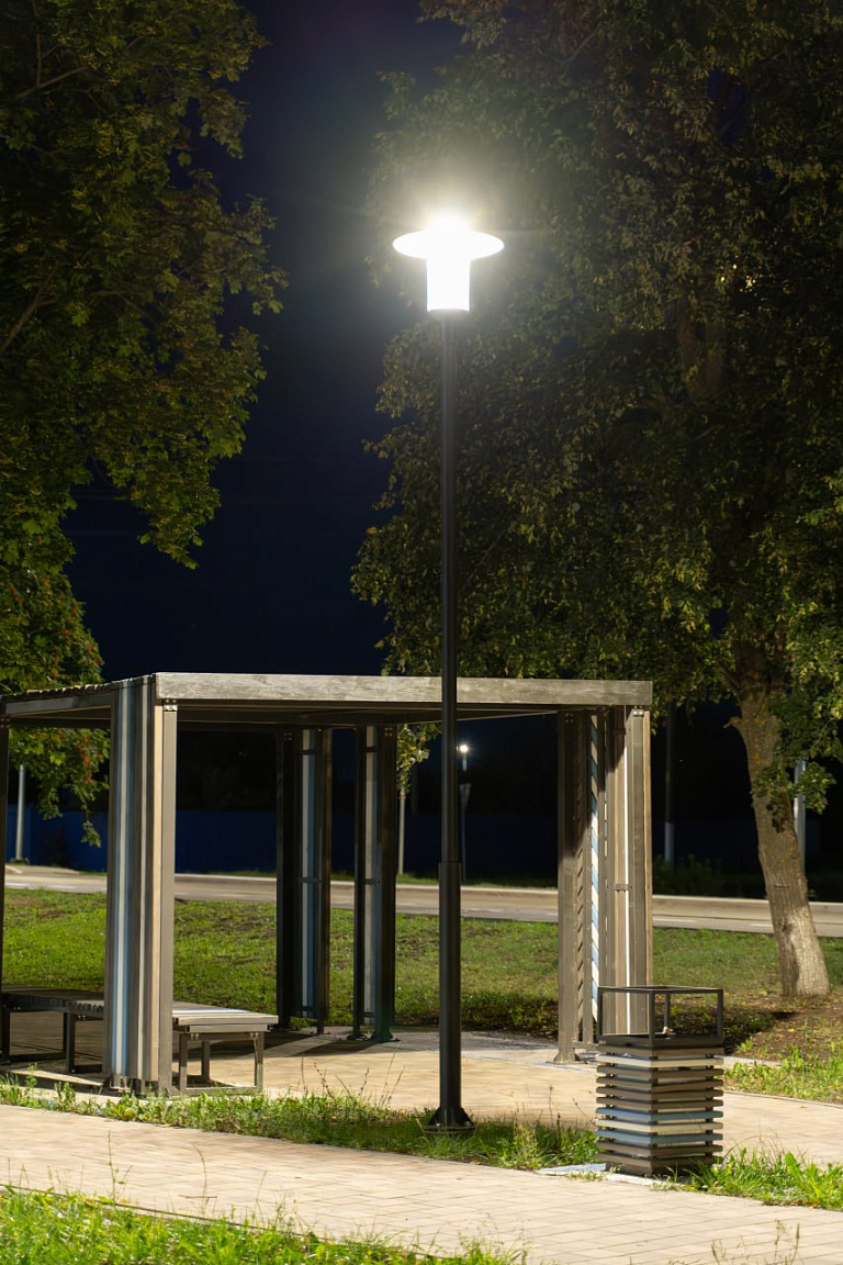 Верхняя часть защищена широким металлическим козырьком, который направляет поток света вниз. Подходит для парков, аллей и прогулочных дорожек.