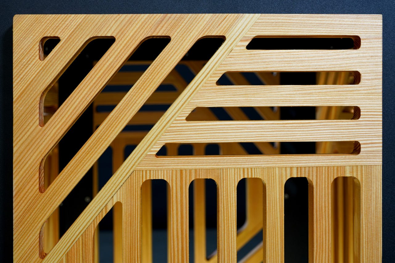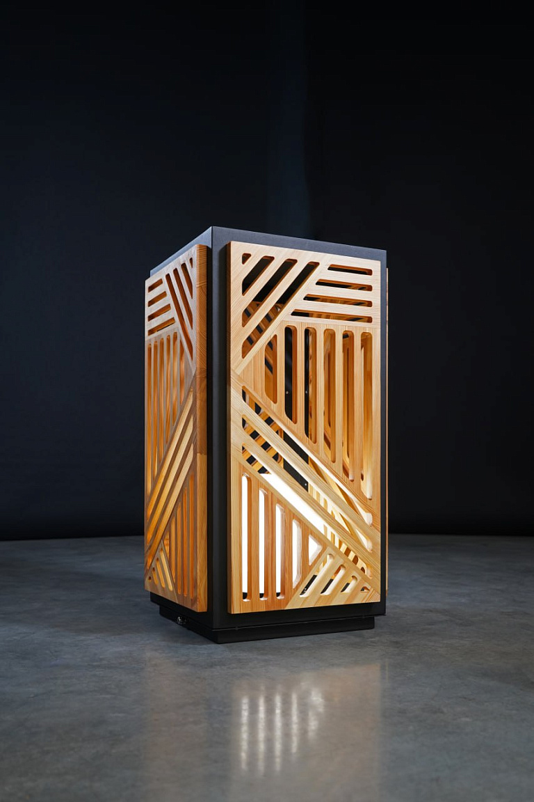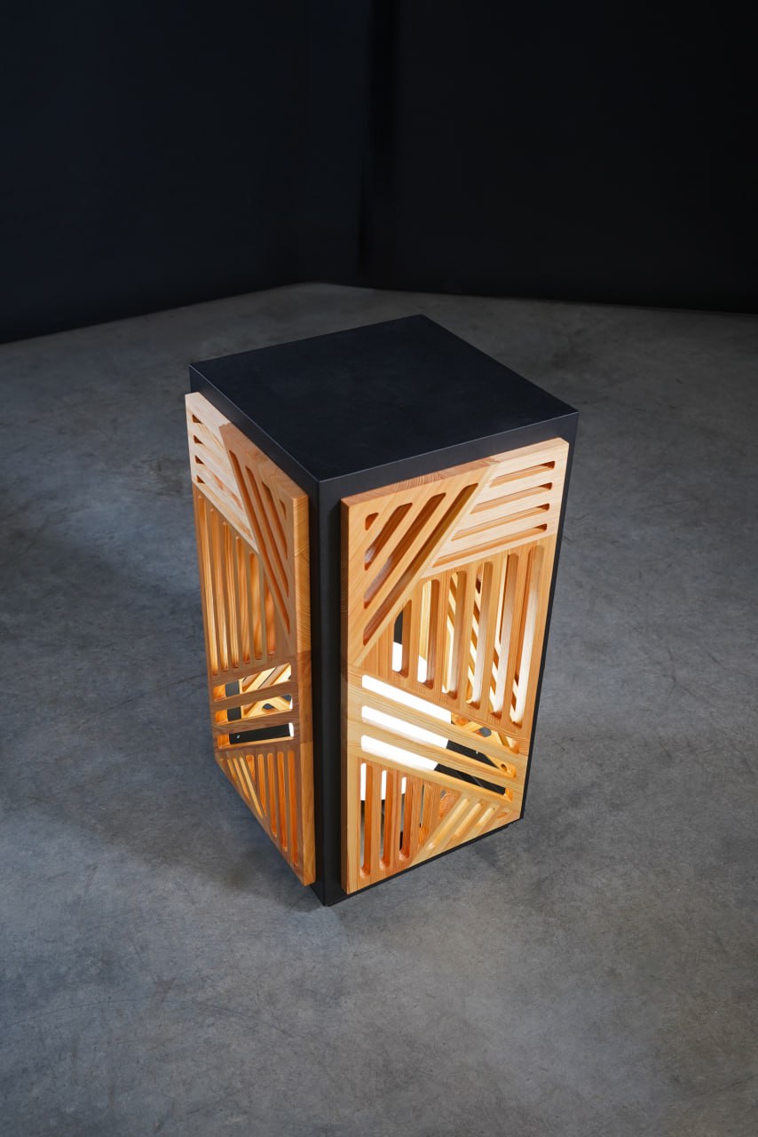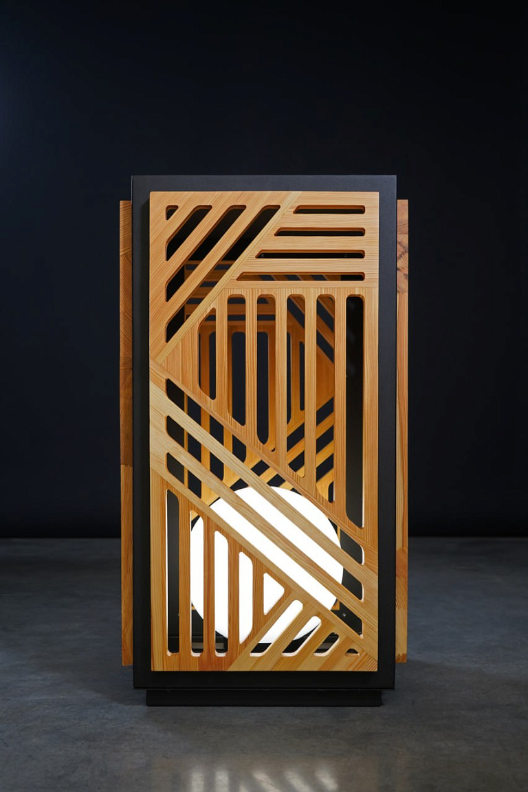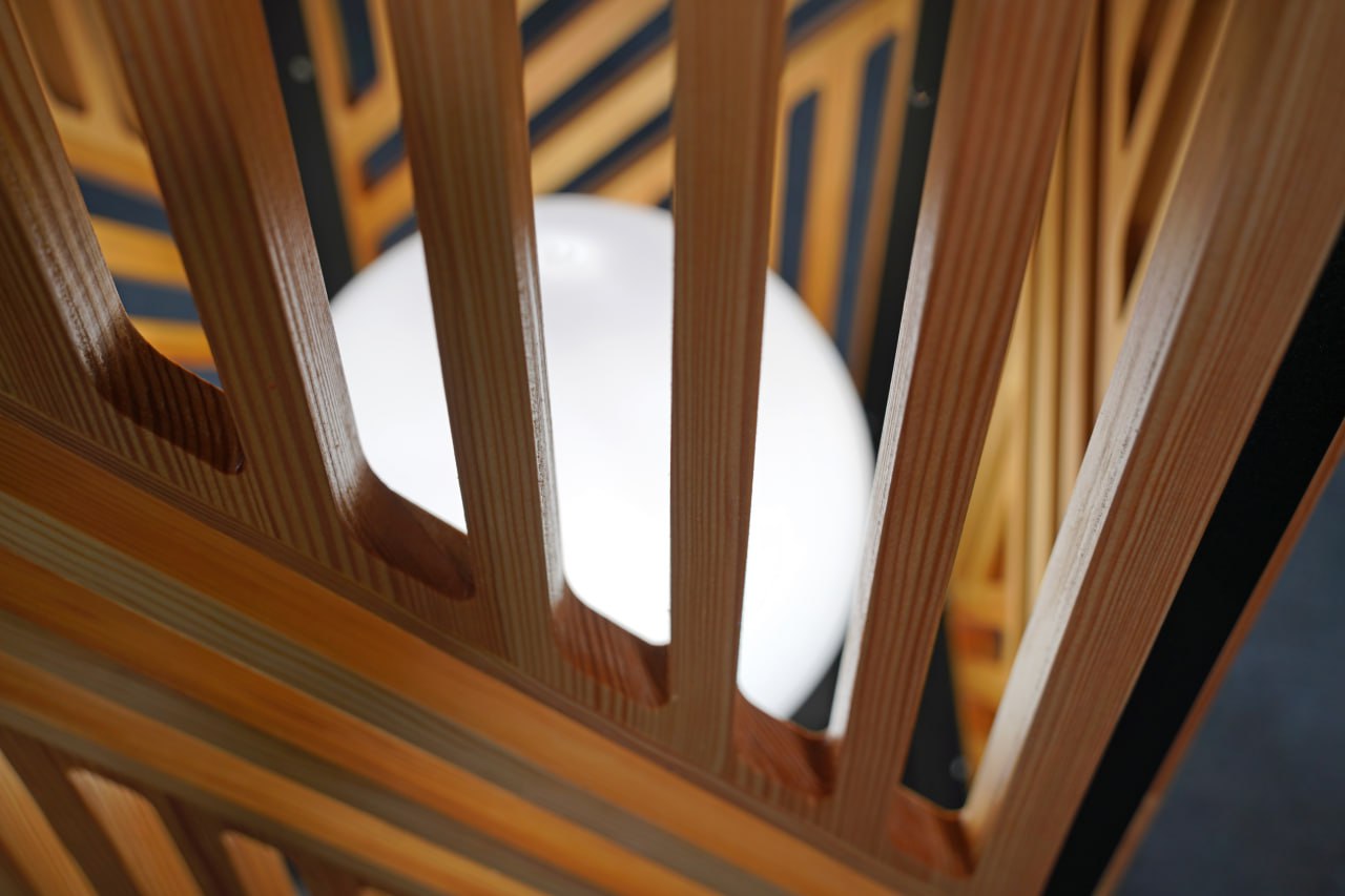Светильник выглядит очень необычно и стильно! Он имеет прямоугольную форму и состоит из нескольких элементов, превосходно сочетающихся друг с другом. Внешний слой - это деревянная панель с геометрическим узором из прямых линий, образующих разные фигуры, а внутри нее - рама черного цвета. В центре светильника находится светящийся шар, который создает мягкий и рассеянный свет. Современный и минималистичный, светильник станет интересным акцентом в любом интерьере.