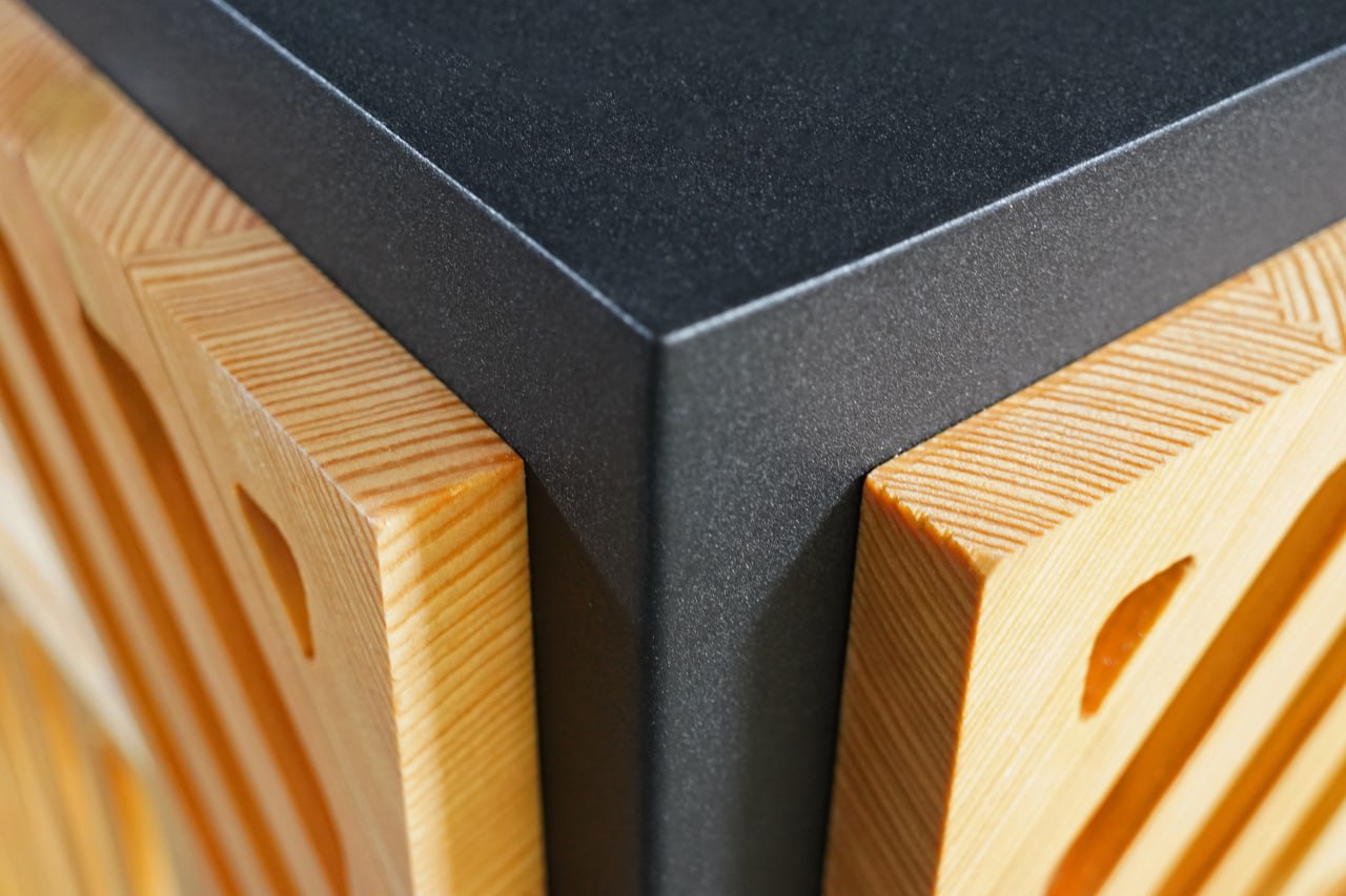 Стильный дизайн: черный муар и фактура лиственницы создают благородный и современный образ, светящийся шар добавляет уникальности.
