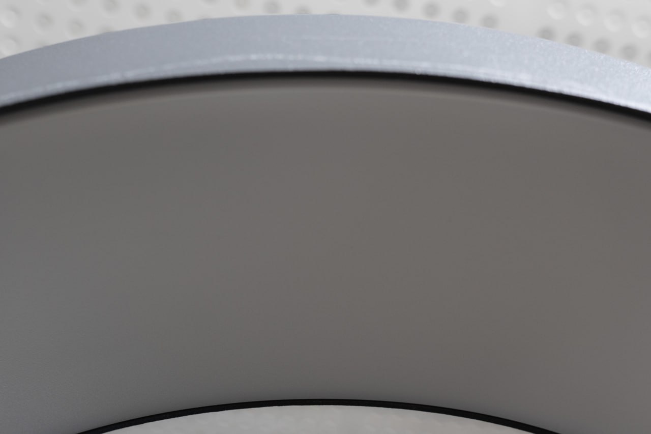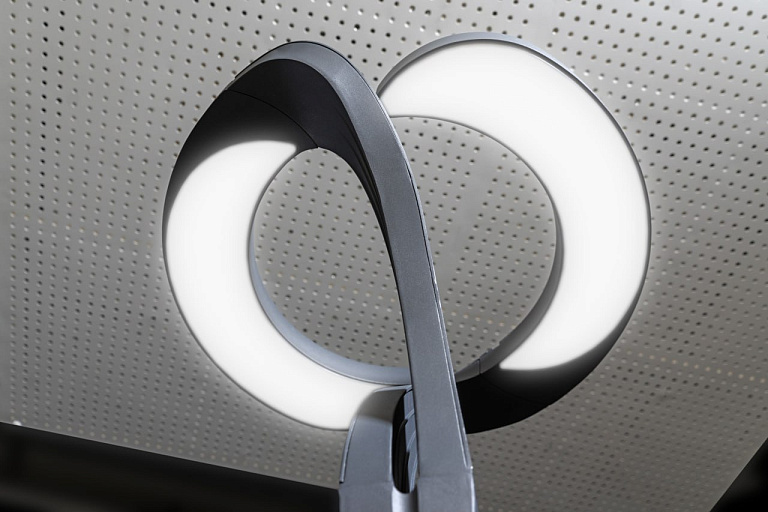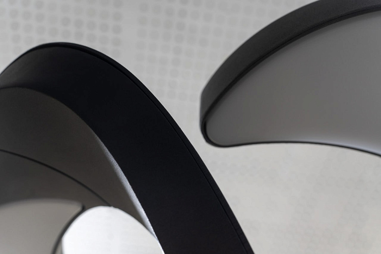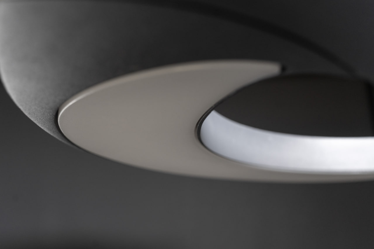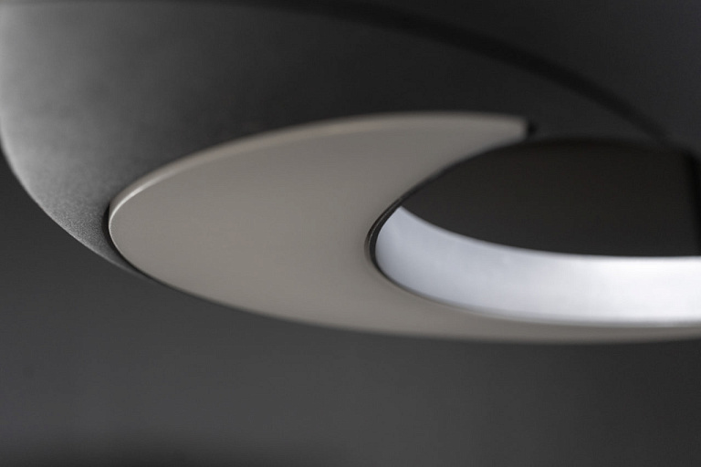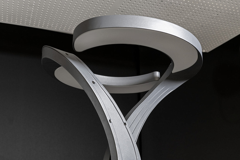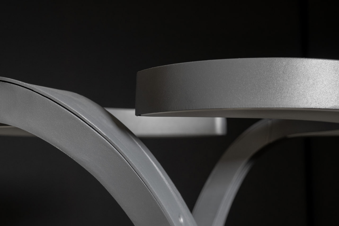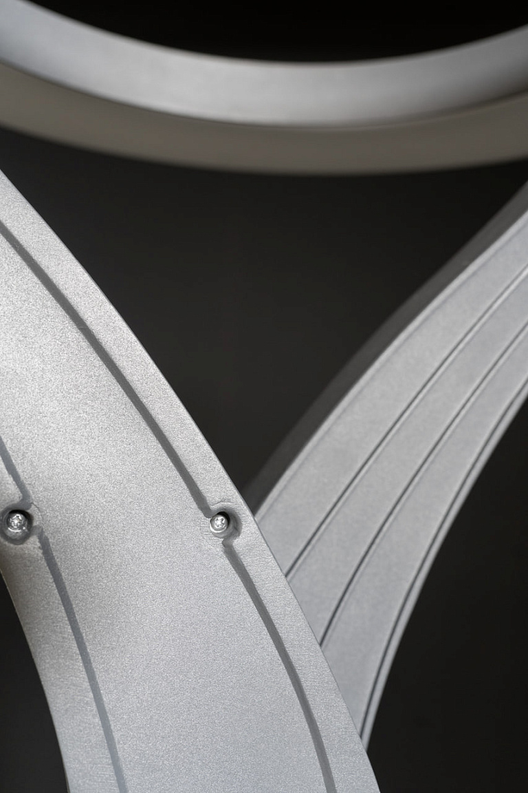 Основание выполнено в виде плавно изогнутых алюминиевых элементов, которые пересекаются, образуя динамичную конструкцию. Верхняя часть — полукруглые пластины с рассеивателем, создающие мягкое и равномерное свечение. Покрытие графитовый серый муар подчёркивает технологичность формы.